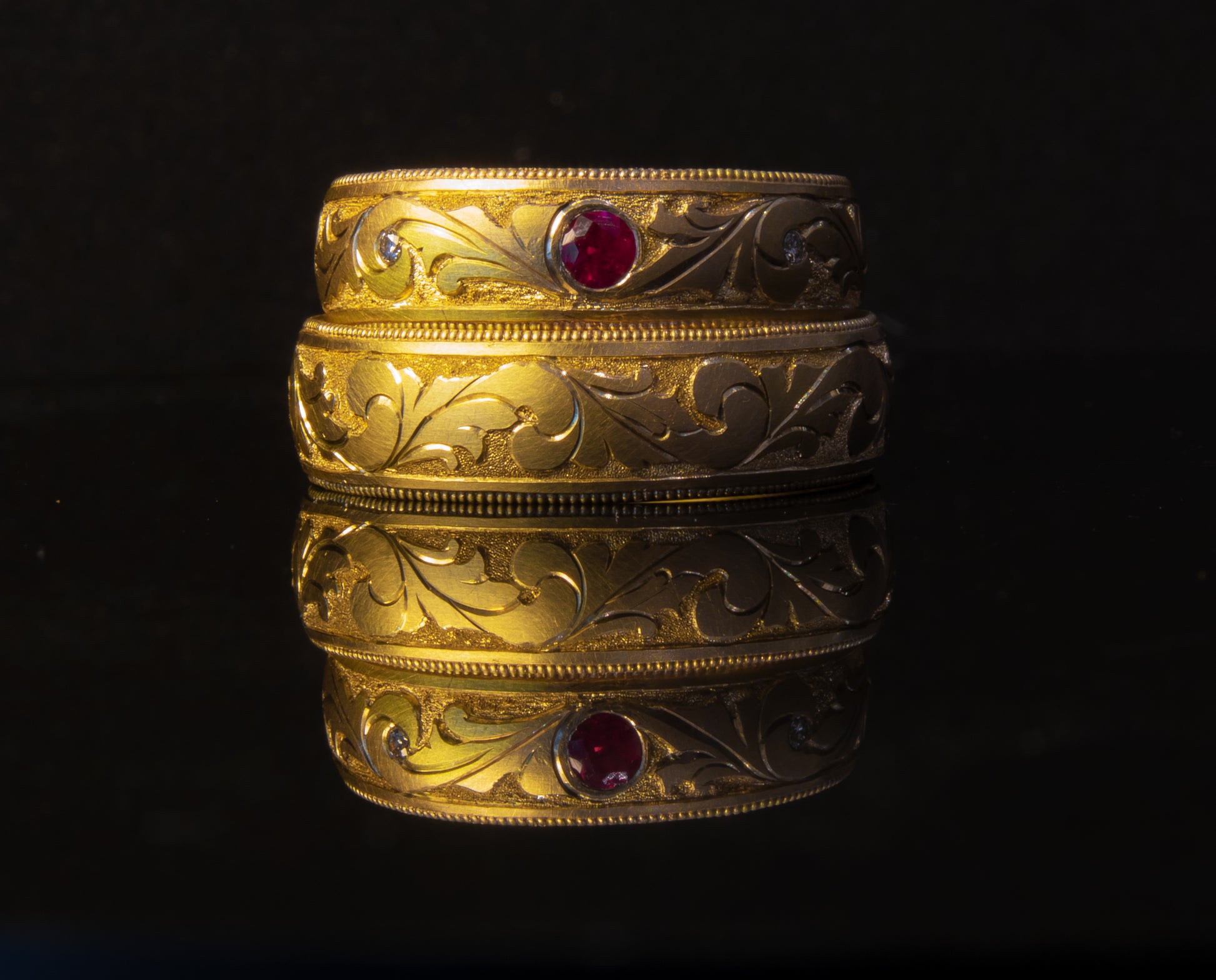 Handgravierte Eheringe mit einem Rubin und Brillanten. Die Gravur wurde als Deep Relief-Gravur ausgeführt. Die Ringe wurden im fugenlosen Sandguss erstellt. Die Seiten erhielten eine Verzierung mit Millegriffeskugeln.
