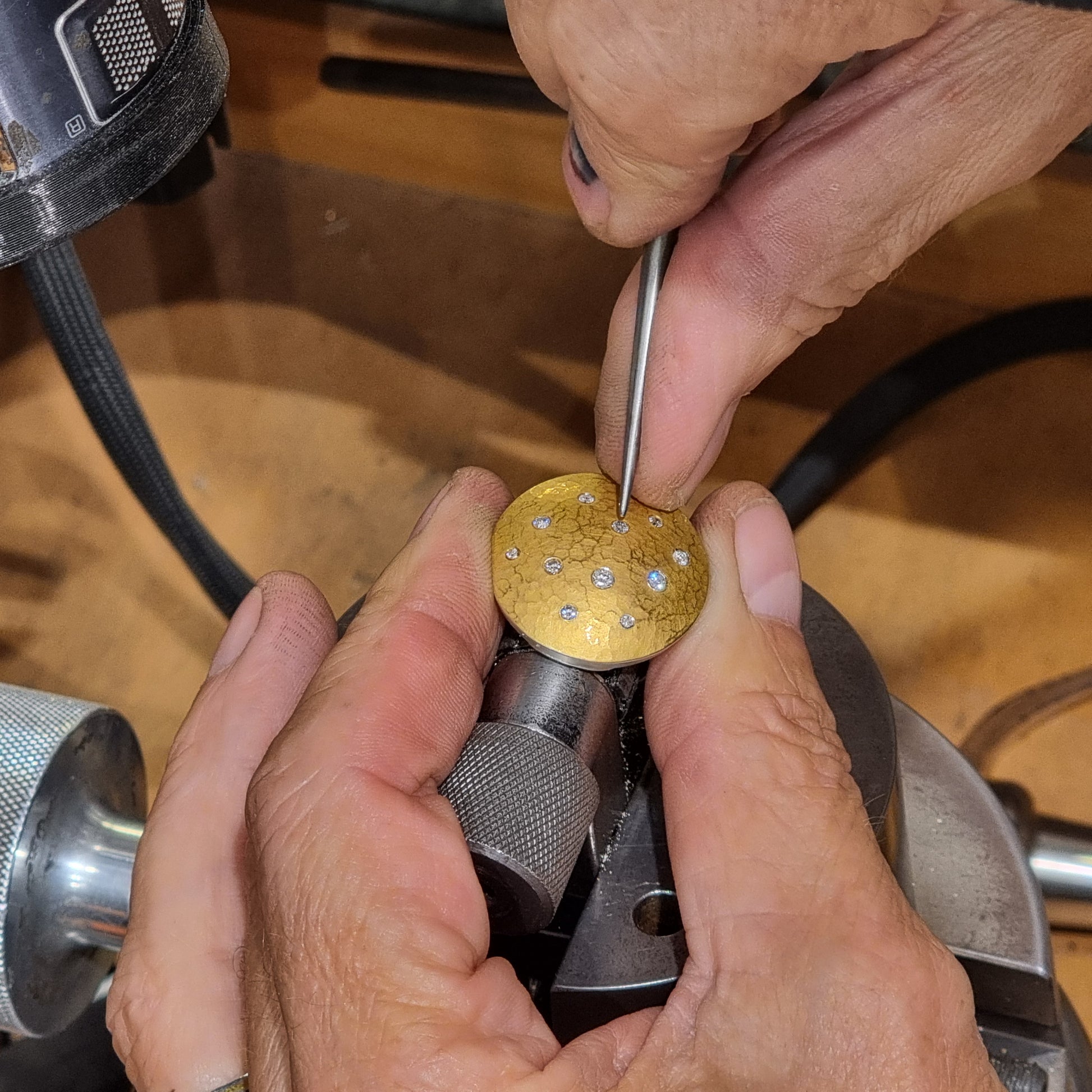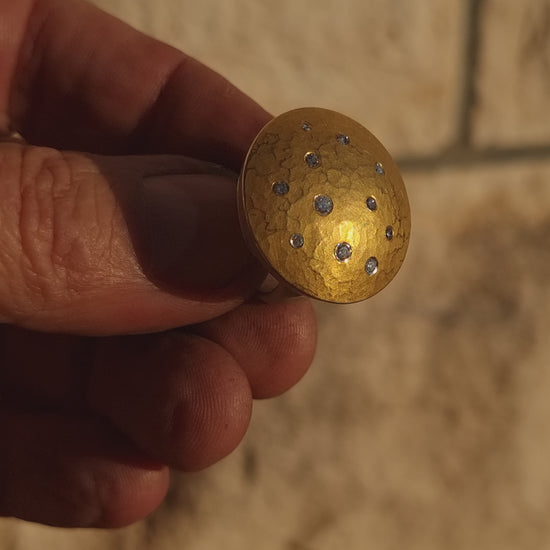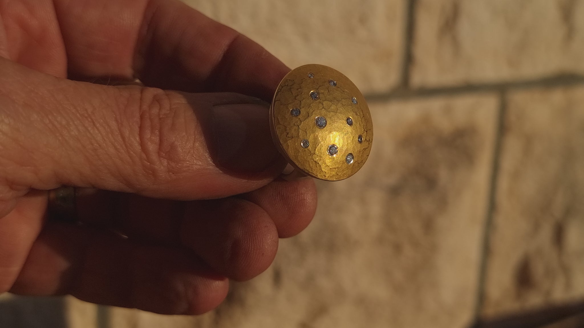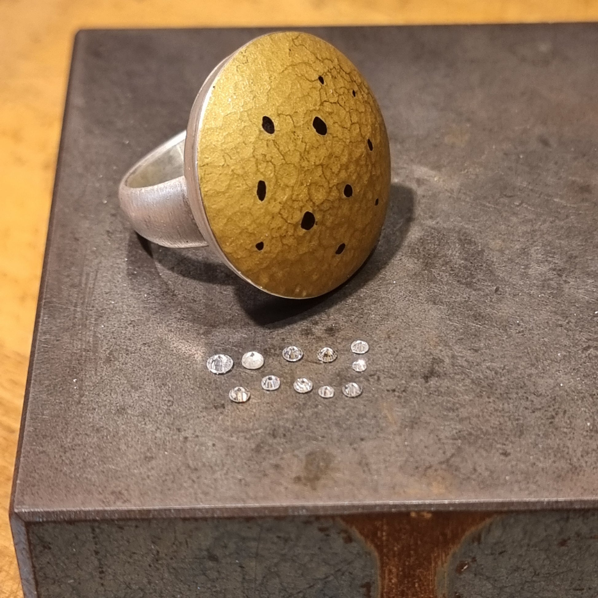 Dieser handgefertigte Ring besteht aus Silber und Gold. Auf der Oberseite sind elf Brillanten eingelassen, die den kroatischen Sternenhimmel im November darstellen.